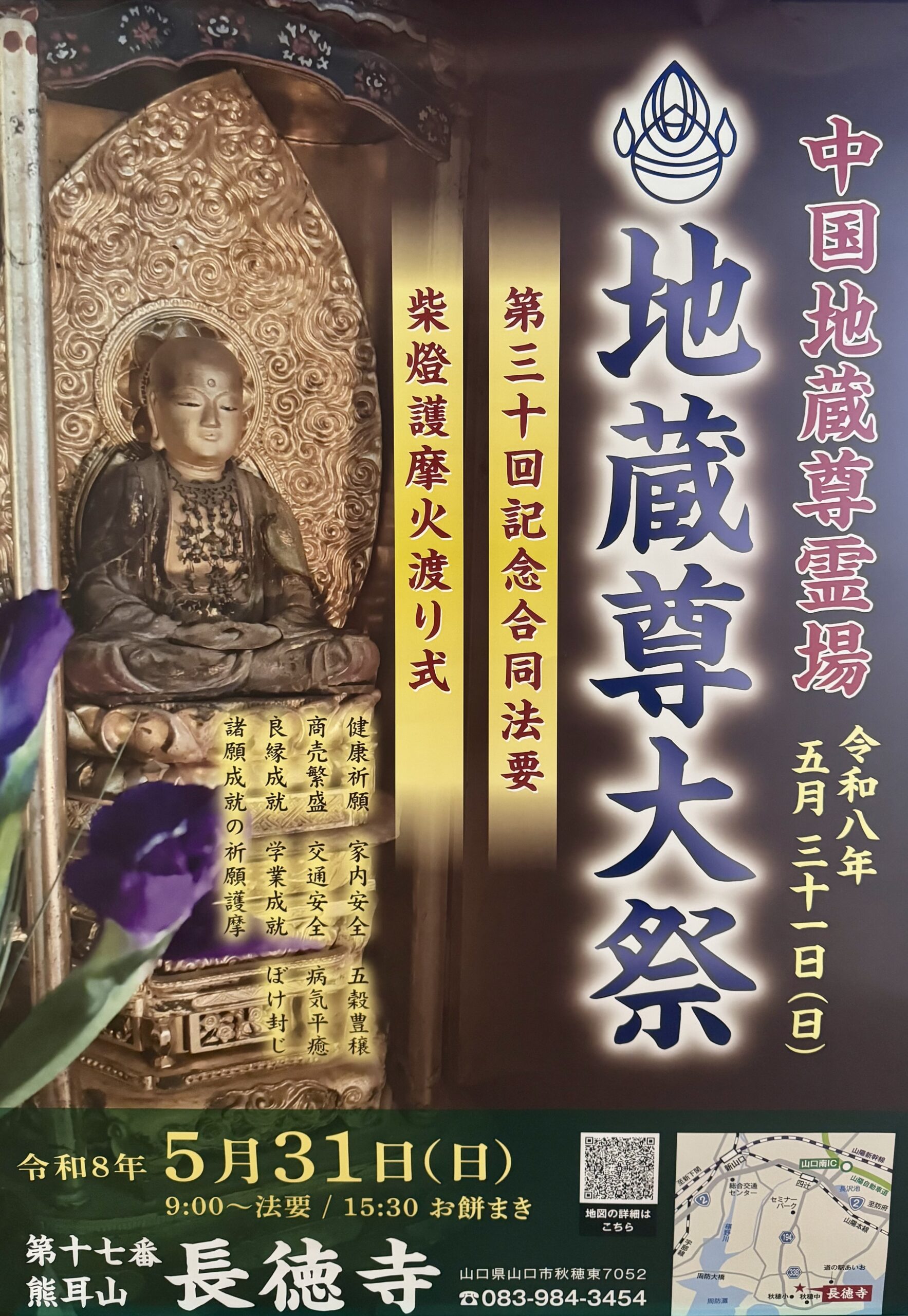 今年度の合同法要は、令和8年5月31日(日)山口の長徳寺を会場として開催されます。第30回の記念法要として、各霊場寺院が集まり【地蔵尊大祭】となる合同法要を厳修いたします。この勝縁を機にぜひお参りください。